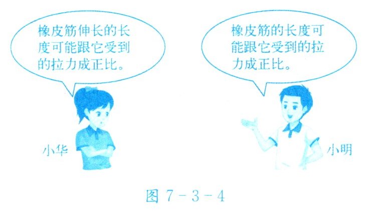 11. 在制作橡皮筋测力计的活动中,同学们发现:在一定的范围内,橡皮筋受到的拉力越大,橡皮筋的长度越长。根据这一现象,小明和小华提出如下猜想(图7-3-4)。究竟谁的猜想正确呢?他们决定一起通过实验来验证自己的猜想。