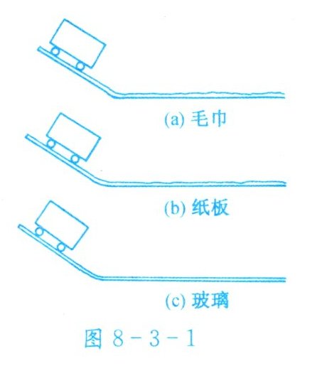 6. 如图8-3-1所示,在研究阻力对物体运动的影响的实验中,将同一小车从同一斜面的同一高度滑下,使它在三种不同表面的水平轨道上继续运动。