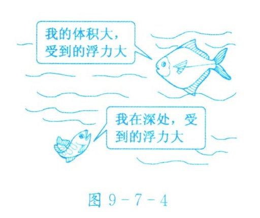 8. 如图9-7-4所示,大鱼和小鱼的争论中,______(大/小)鱼的说法是正确的,这是因为两条鱼浸没在同种液体中,它们受到的浮力的大小与______有关。