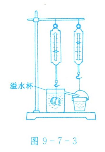 7. 如图9-7-3所示,在左边的弹簧测力计下挂一个物体,在右边的弹簧测力计下挂一个小桶。然后,将物体浸没于装满水的溢水杯中,并让溢出的水全部流入小桶中。实验发现,两个弹簧测力计示数变化的数值相等。根据上述实验,可以得出的实验结论是______。