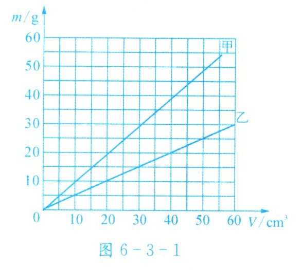 13. 图6-3-1所示是甲、乙两种物质的$m-V$图像,请根据图像判断甲、乙两种物质密度的大小关系,并说明理由。