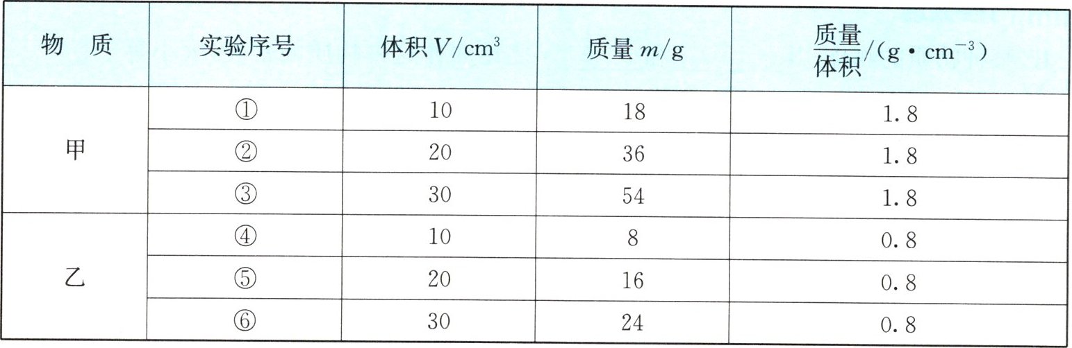 |物质|实验序号|体积$V/cm^3$|质量$m/g$|质量/体积$(g\cdotcm^{-3})$|