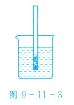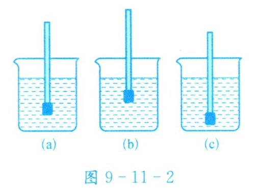 2. 将适量的橡皮泥粘在铅笔的一端(能使铅笔竖直浮在液体中),这样就制成了一个简易仪器。将它分别放在盛有不同液体的烧杯中,静止时的情景如图9-11-2所示。关于这个简易仪器,下列说法中不正确的是( )。