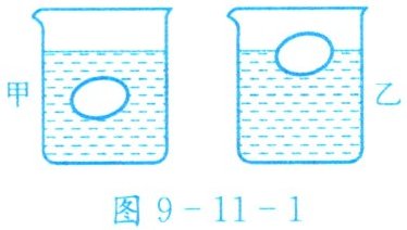 1. 如图9-11-1所示,甲、乙两杯盐水的密度分别为ρ甲、ρ乙。将同一个鸡蛋先后放入甲、乙两只烧杯中,鸡蛋在甲杯中处于悬浮状态,所受浮力为F甲;鸡蛋在乙杯中处于漂浮状态,所受浮力为F乙,则下列关系中正确的是( )。