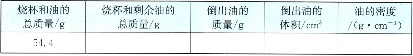 | 烧杯和油的总质量/g | 烧杯和剩余油的总质量/g | 倒出油的质量/g | 倒出油的体积/cm^3 | 油的密度/(g·cm⁻^3) |