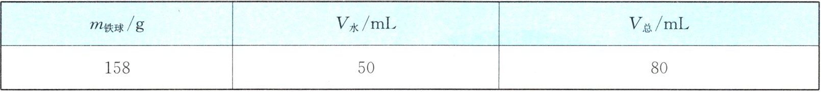 22. 小明想判断一个铁球是实心的还是空心的,于是设计了如下实验:① 用调节好的天平测出铁球质量mₜᵢₑ球;② 向量筒中注入适量水,并读出体积Vₚ;③ 将铁球浸没在量筒的水中,读出水和铁球的总体积Vₜₒₜ。他记录的数据如下表所示。$(ρₜᵢₑ= 7.9×10^3 kg/m^3)$