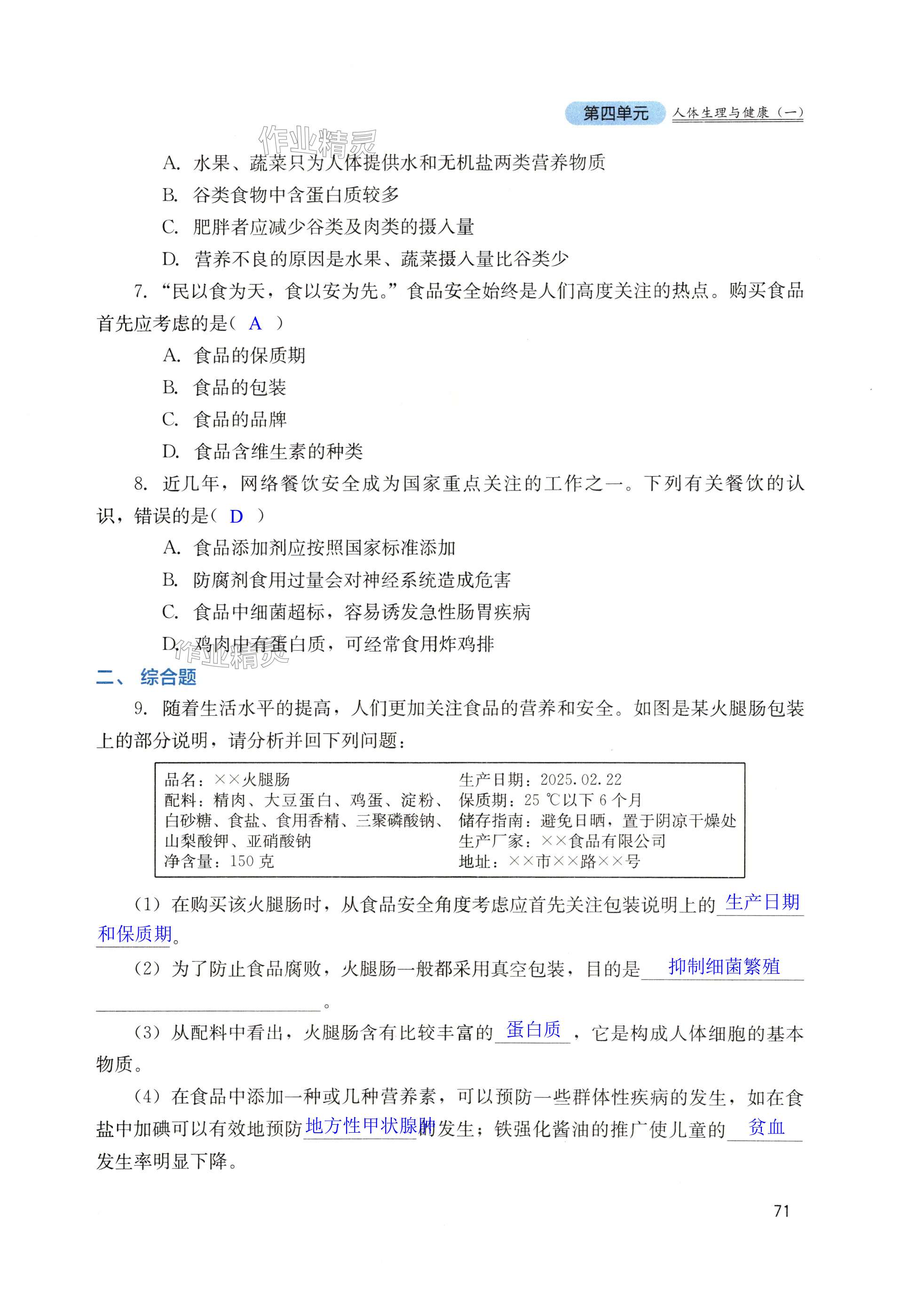 注:目前有些书本章节名称可能整理的还不是很完善,但都是按照顺序排列的,请同学们按照顺序仔细查找。练习册 2025年新课程实践与探究丛书七年级生物下册人教版 答案主要是用来给同学们做完题方便对答案用的,请勿直接抄袭。