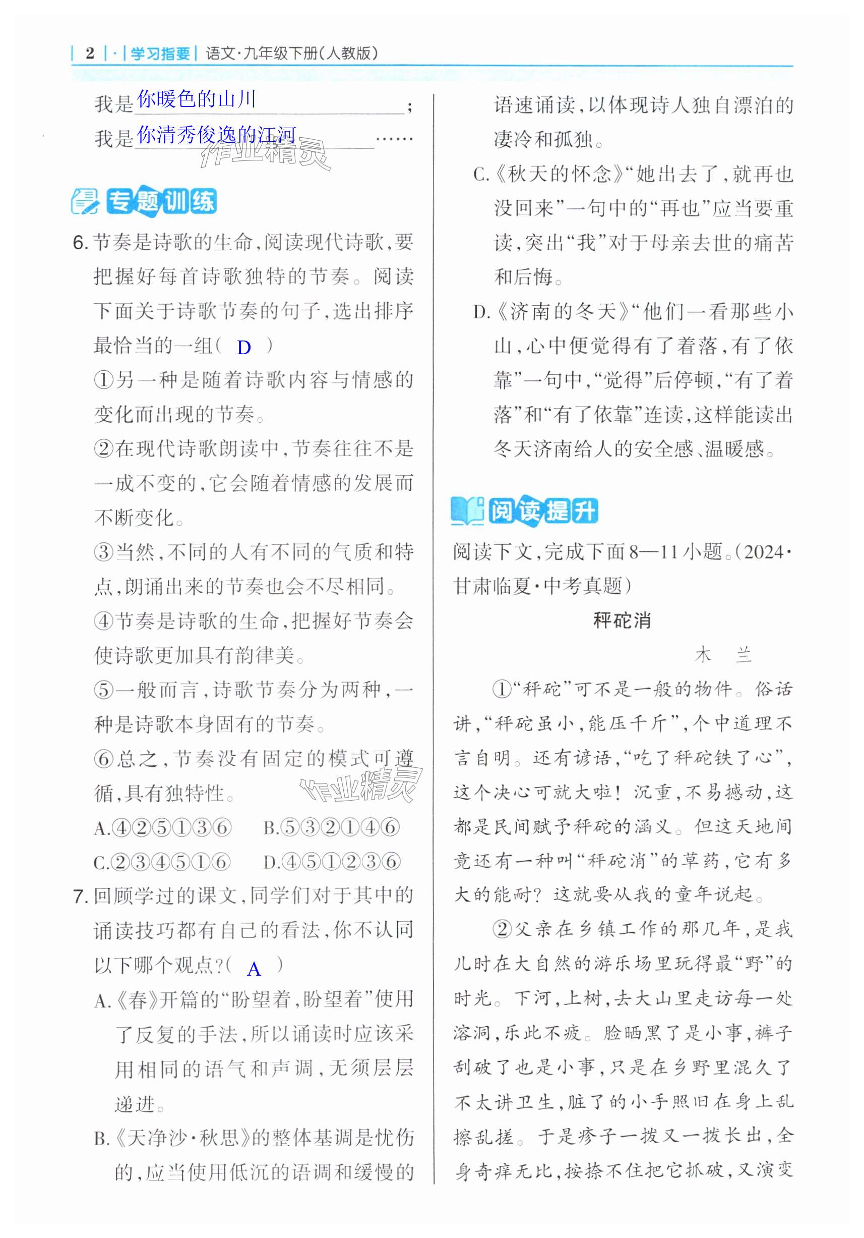 注:目前有些书本章节名称可能整理的还不是很完善,但都是按照顺序排列的,请同学们按照顺序仔细查找。练习册 2025年学习指要九年级语文下册人教版 答案主要是用来给同学们做完题方便对答案用的,请勿直接抄袭。