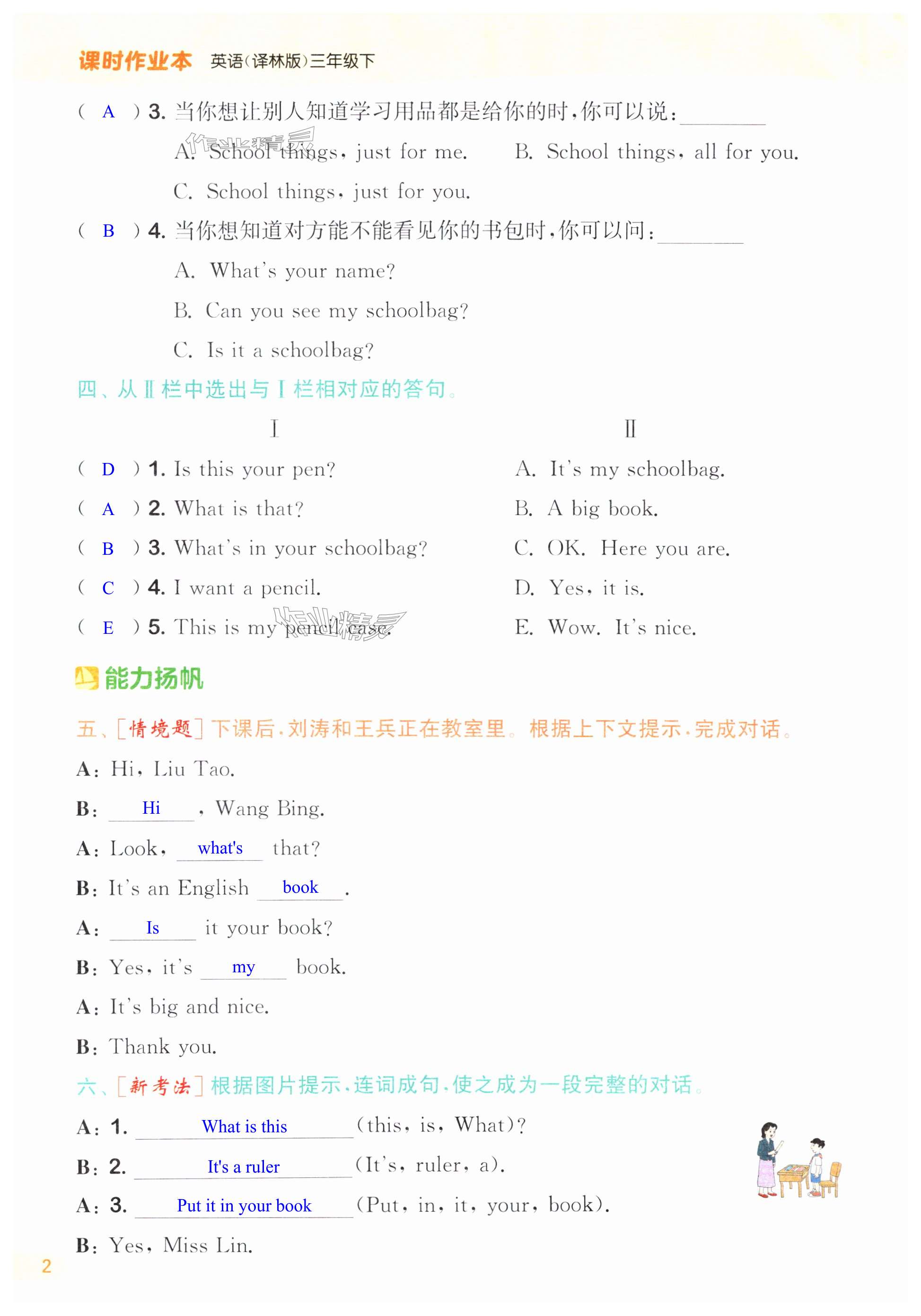 注:目前有些书本章节名称可能整理的还不是很完善,但都是按照顺序排列的,请同学们按照顺序仔细查找。练习册 2025年通成学典课时作业本三年级英语下册译林版苏州专版 答案主要是用来给同学们做完题方便对答案用的,请勿直接抄袭。