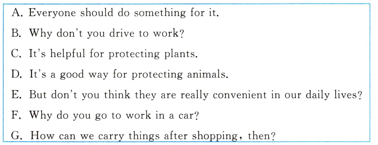 根据对话内容,从方框中选出五个适当的句子补全对话。(其中有两项为多余选项)