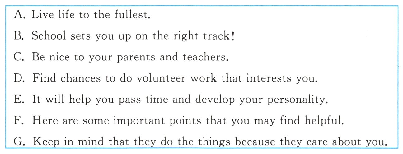 .Do well in school.No matter how boring it is now,education will help you be a productive member in society.Try your best for excellence in school:listen to the teachers,do your homework,study,and get good grades.Doing so will help you get into a better university,which will enable you to have a bright future.(2)_______