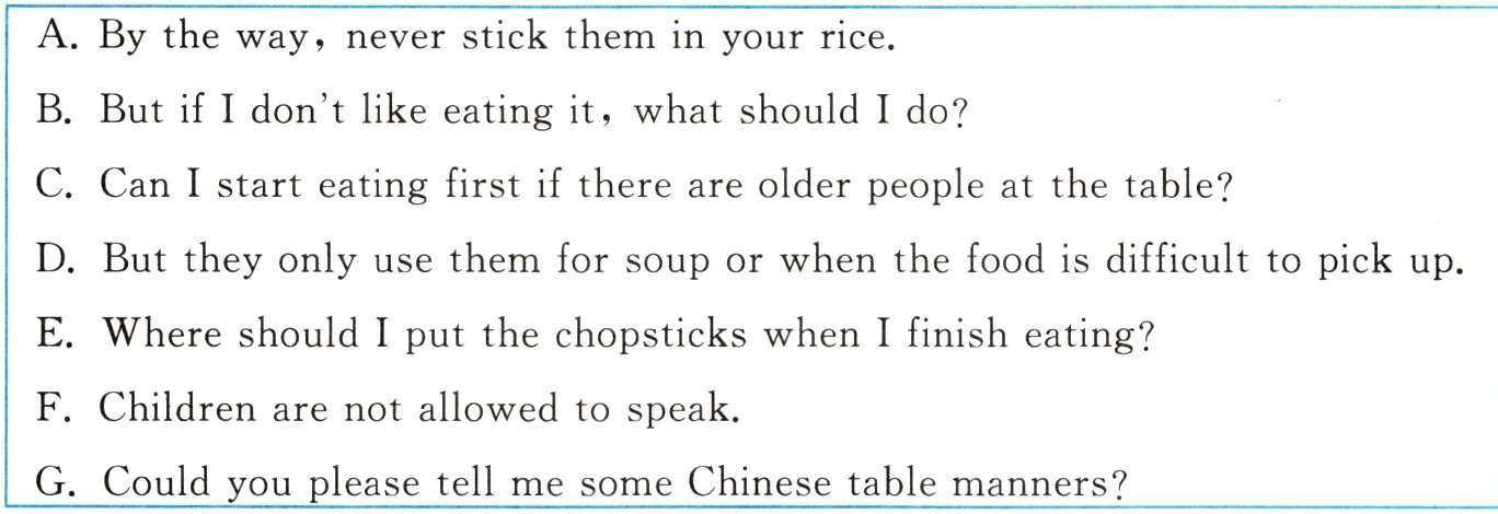 A:Er,...Sometimes the Chinese will use their own chopsticks to put food in your bowl to show their kindness.Don't refuse it.