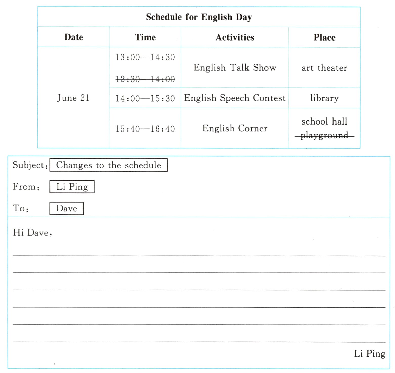 你校英语节安排表(Schedule)较之前做了些调整。请给外教老师戴夫(Dave)写一封80词左右的电子邮件,告知他调整的内容并给出你认为恰当的理由。