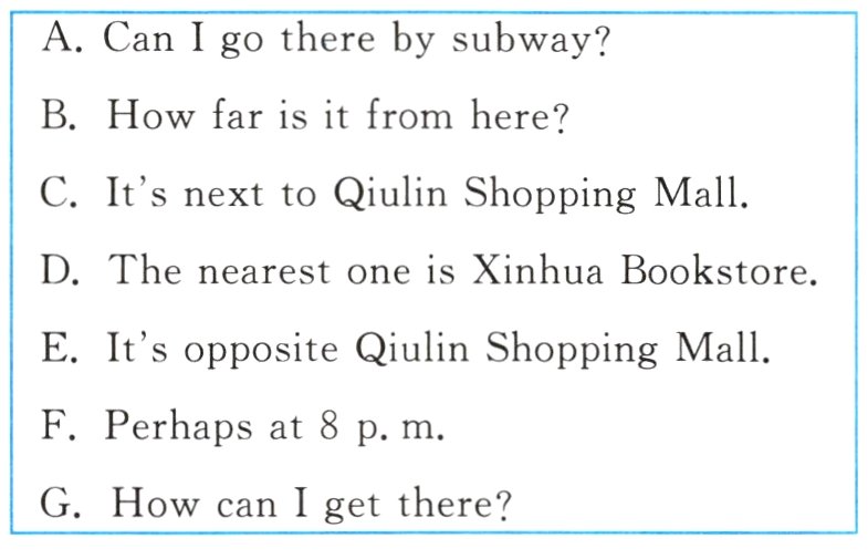 B:Certainly. Go along the street and turn right at the third turning. Then walk until you see Qiulin Shopping Mall. (2)________