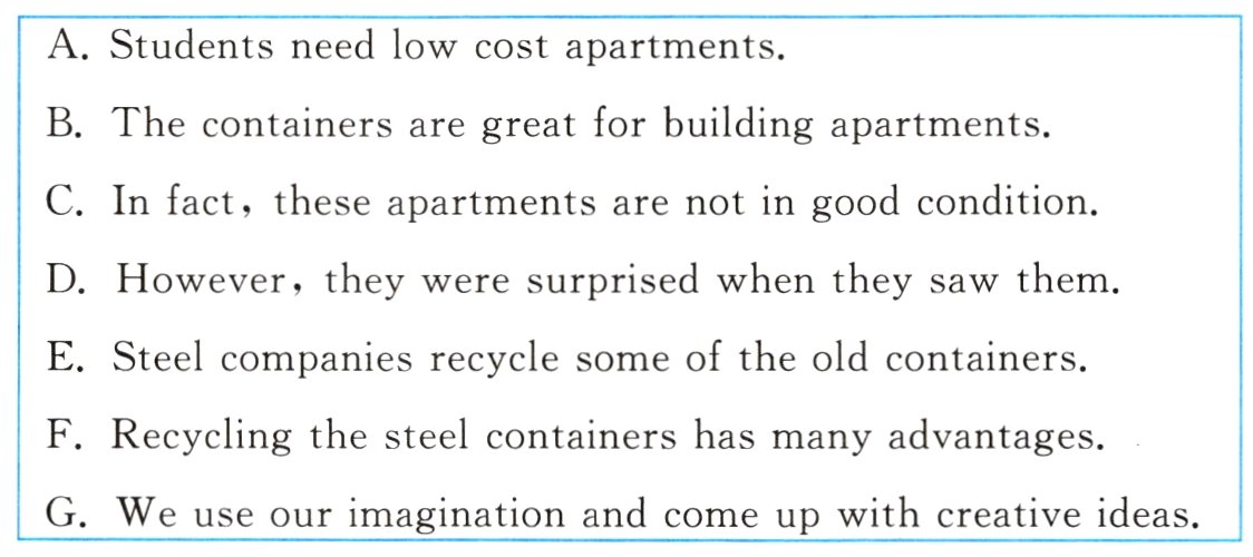 Back in Amsterdam, a company came up with an amazing idea. Why not reuse these shipping containers as student apartments? (4)________ They are all the same size and fit together perfectly. The steel is strong. Moreover, these containers are so widely available that they are quite cheap to buy. For all these reasons, they can be used to build apartments quickly and cheaply. Building began in 2005, and after only a few weeks, hundreds of Amsterdam students had new homes.