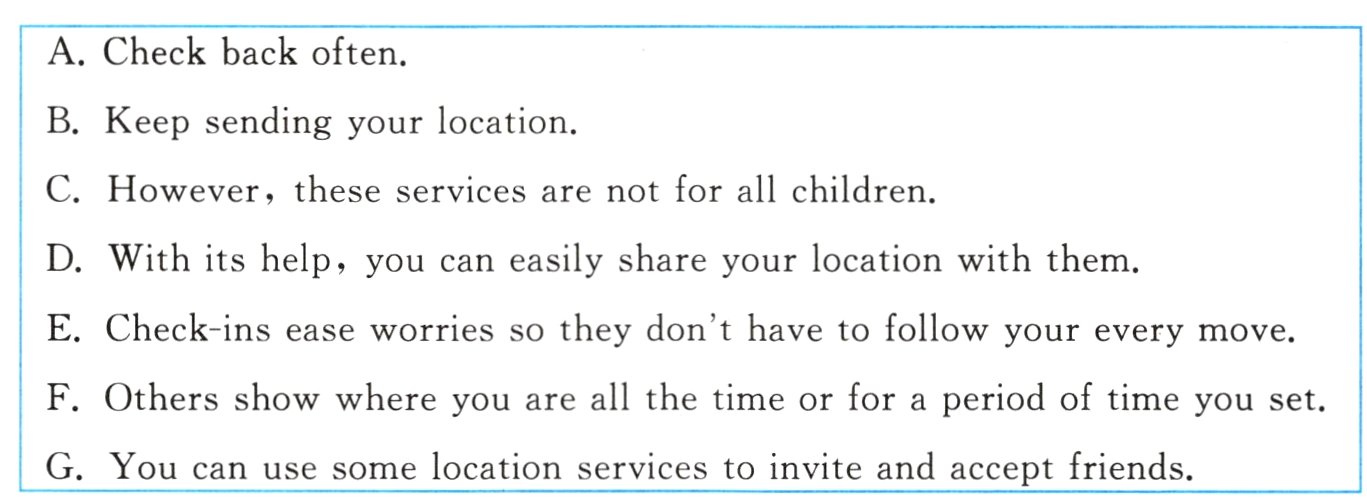 (4) ______ Some services automatically(自动地) stop sending your location after a period of time, but others will send it forever — until you stop it. Review your contact list periodically(定期地) and delete anyone to whom you no longer feel comfortable revealing your location.