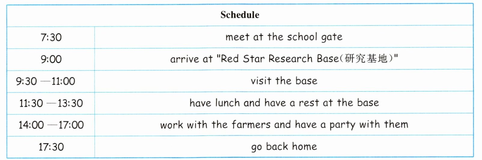 Today is Saturday. It's sunny. Our class has a research tour at "Red Star Research Base". I'm excited, so I get up at six in the morning today. We meet at the school gate. We go there by bus. We arrive there at 9:00 a.m. Then we visit the base. We have lunch there. In the afternoon, we help the farmers plant seedlings(秧苗), water the vegetables and then we have a party with them. We go back home at 5:30 p.m. We're tired but really happy.