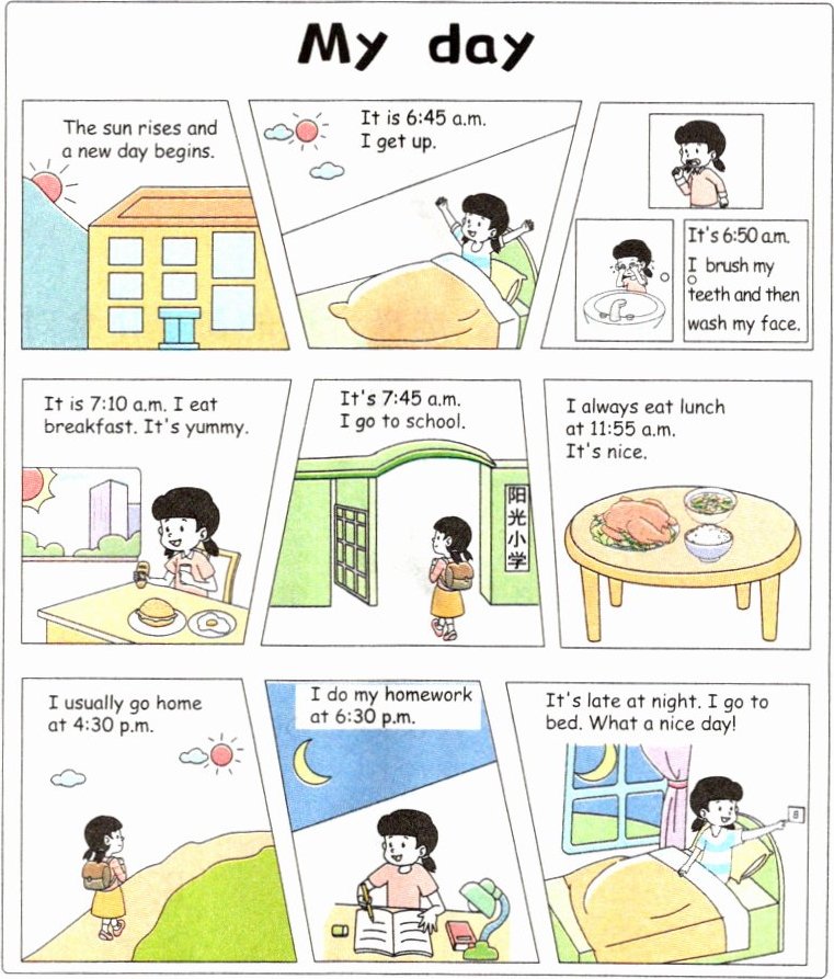 Task 2:根据你绘制的连环画,向你的老师和同学们介绍一下你的一天吧!