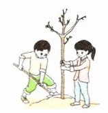 A. Has a birthday party. B. Plants trees. C. Makes a birthday card.