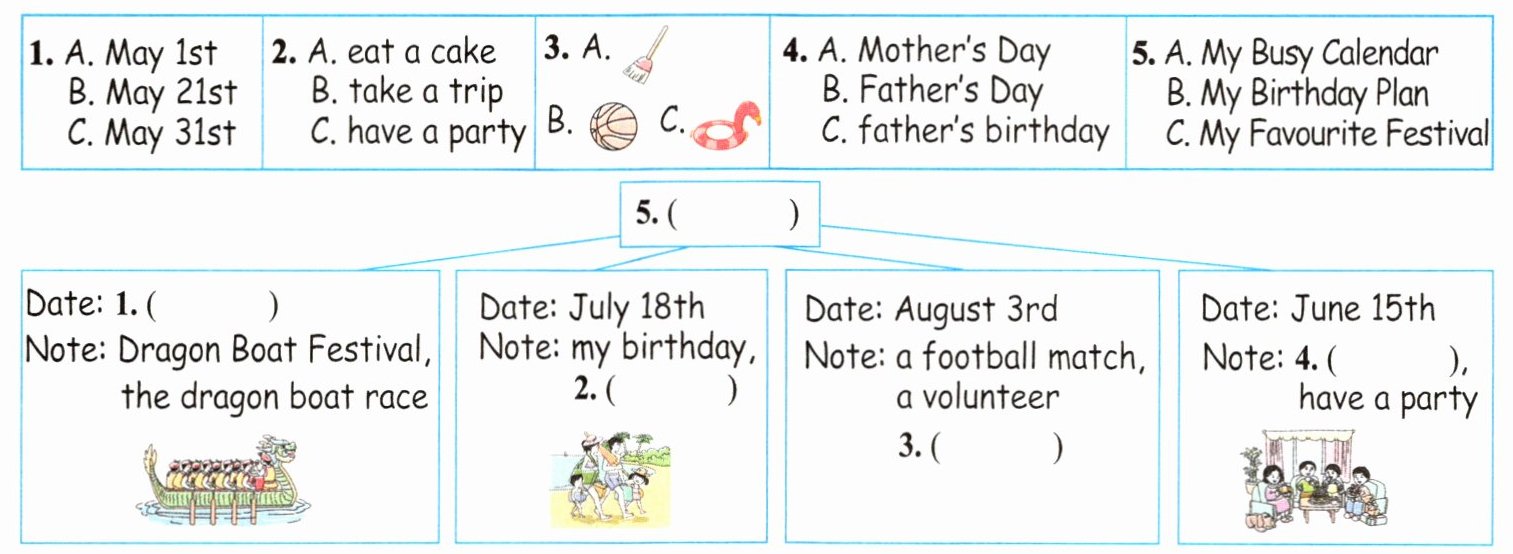 My favourite festival is Dragon Boat Festival. It is on May 31st this year. Look at this picture. I am taking part in(参加)the dragon boat race. My birthday is on July 18th. It is in summer vacation. Mum says my family will take a trip to Sanya. I can swim. Great! On August 3rd, I will have a football match(比赛). I can't play football. I'm a volunteer. I'll clean the playground. Father's Day is on June 15th. Look! We are having a party. Dad is very happy.