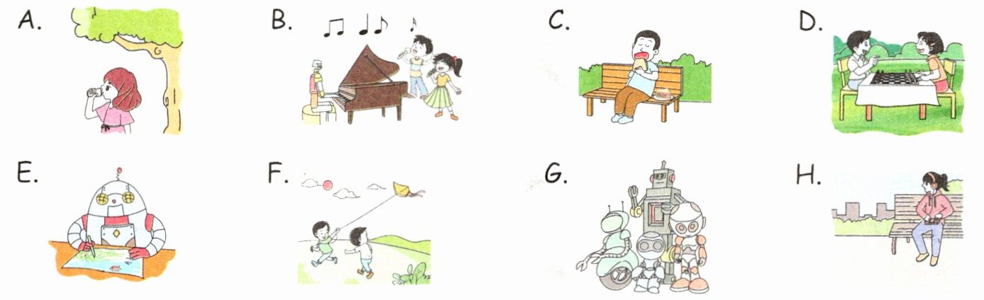 - **It's warm today. My friends and I are in the park. Look! I'm eating sandwiches. Nancy is listening to music. David and Lily are playing chess. Daming is so excited. He is flying a kite with Sam. Amy is drinking water under the tree. What a great Sunday!**