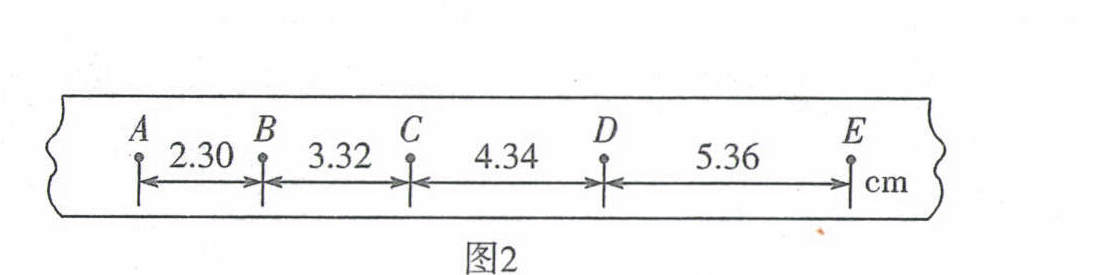 (2)如图2所示为选取的一条纸带的部分,$A、B、C、D、E$为选取的连续5个计数点,每相邻两个计数点间还有1个点未画出,则打点计时器打$B$点时小车的速度大小为__________m/s,小车的加速度大小为__________m/s²。(结果均保留2位有效数字)