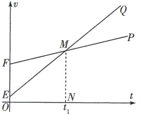 11. 两辆汽车$P$和$Q$在一条平直公路上同向行驶,它们的$v - t$图像如图所示,其中$\triangle EFM$的面积为$x_0$,梯形$OEMN$的面积为$2x_0$。$t = 0$时,$Q$在$P$前$\frac{8}{9}x_0$处,下列判断正确的是