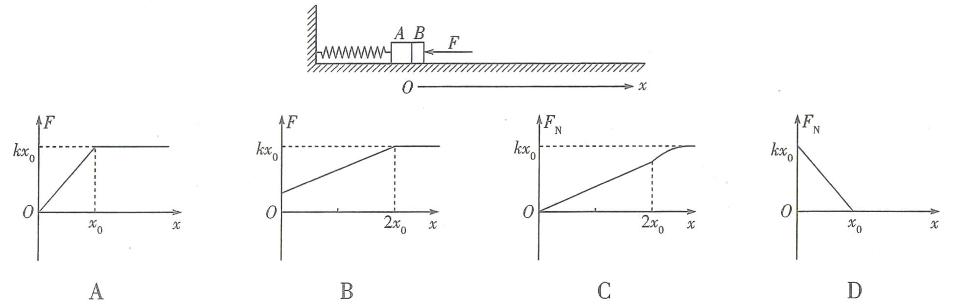 7. 如图所示,光滑的水平地面上,可视为质点的两滑块A、B在水平外力F的作用下紧靠在一起压紧弹簧,弹簧左端固定在墙壁上,此时弹簧的压缩量为3x₀,以此时滑块B的位置为坐标原点建立如图所示的一维坐标系。某时刻突然改变外力使B向右做匀加速运动,加速度为a = kx₀/m(其中k为弹簧的劲度系数)。已知A、B的质量关系为mₐ = 2mᵦ = 2m,关于外力F、两滑块之间的弹力Fₙ与滑块B的位移x之间的关系,下列图像可能正确的是