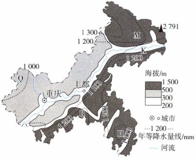 分析数据了解市情,是因地制宜促进区域发展的依据。下图为重庆地形和年等降水量线分布图。据此完成1 - 2题。