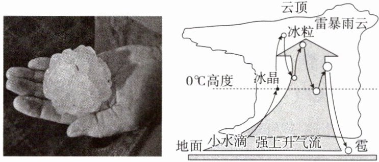 当地时间2023年7月18日,意大利部分地区气温达到40℃。而在经历了强烈热浪之后,又迅速迎来冷空气。威尼托大区在7月19日起遭遇强风与冰雹等极端天气,冰雹如网球般大小。下左图为威尼托大区冰雹景观图,右图为冰雹形成原理图。据此完成1~2题。