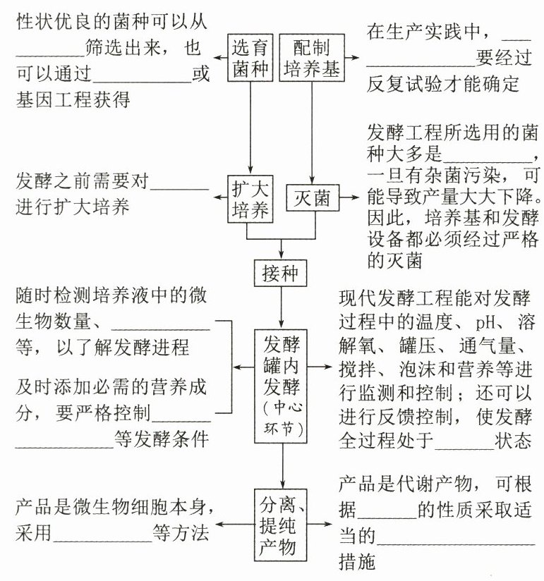 自然界@@诱变育种@@菌种@@菌种@@单一菌种@@产物浓度@@温度、pH和溶解氧@@最佳产物@@过滤、沉淀@@培养基的配方@@提取、分离和纯化