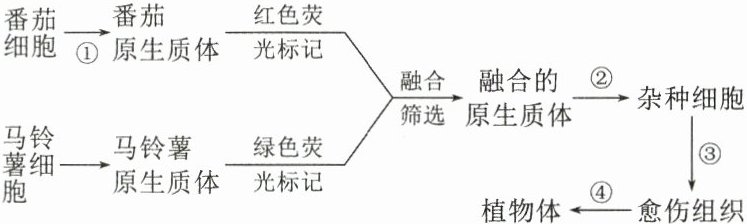 (3)植物原生质体融合过程常利用______等诱导融合,在鉴定杂种原生质体时可用显微镜观察,根据细胞膜表面荧光的不同可观察到______种不同的原生质体,当观察到______时可判断该原生质体是由番茄和马铃薯融合而成的。