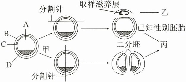 囊胚腔@@透明带@@滋养层@@内细胞团@@胚胎分割@@做DNA分析性别鉴定@@胚胎移植@@滋养层细胞@@显微操作仪和实体显微镜@@将内细胞团均等分割@@同卵双胎@@解析 (1)根据囊胚的结构可知题图中字母所代表的结构名称分别是,A为囊胚腔;B为透明带;C为滋养层;D为内细胞团。(2)题图中甲、乙、丙过程表示的技术分别是胚胎分割、做DNA分析性别鉴定、胚胎移植。(3)进行乙过程时,所采取的样本是滋养层细胞;进行甲过程时,所使用的基本仪器是显微操作仪和实体显微镜;本过程的技术关键是将内细胞团均等分割。(4)尽管胚胎分割技术在多种动物中已取得成功,但仍然存在一些问题,如刚出生的动物体重偏轻,毛色和斑纹上还存在差异等。同时很难取得同卵多胎,成功率较高的是同卵双胎。