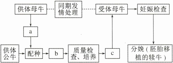 超数排卵@@收集胚胎@@胚胎移植@@产生具有优良遗传特性的胚胎@@健康的体质和良好的繁殖能力@@胚胎分割移植@@桑葚胚或囊胚期@@此时期的细胞具有发育全能性@@可以加快优良种畜的繁殖速度,迅速推广新品种@@解析 (1)a过程是良种母畜在激素刺激下的超数排卵。b是将胚胎进行收集。c是将符合移植要求的早期胚胎移植到受体母畜子宫内的过程。(2)供体母牛的主要职能是提供具有优良遗传特性的胚胎,受体母牛则是提供胚胎发育场所,所以受体母牛应具有健康的体质和良好的繁殖能力。(3)因在桑葚胚期细胞还未开始分化,囊胚内细胞团中胚胎干细胞具有发育全能性,所以应在这两个时期进行分割。