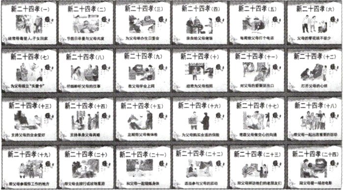 情境 “关手机,陪父母好好吃顿饭”“给爸妈打个电话”“教爸妈用微信”“带爸妈做体检”“出差给爸妈带个小礼物”“走慢一点,等等爸妈” 等在各种场合提醒孝亲的图片悄然流行,被称为“现代二十四孝”。作为中华民族传统孝道文化的集大成者,旧的“二十四孝”中很多内容与时代出现了脱节,已经不符合新社会的新要求。新二十四孝图应运而生,打破了原来二十四孝中的故事所具有的封建迷信色彩,更契合时代发展理念。今天所倡导的新二十四孝之所以能引起广大人民群众的共鸣,最主要的原因还是因为它具有了新的时代内涵。