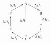 从反应途径角度:$A→D:\Delta H=\Delta H_{1}+\Delta H_{2}+\Delta H_{3}=-(\Delta H_{4}+\Delta H_{5}+\Delta H_{6})$; 从能量守恒角度:$\Delta H_{1}+\Delta H_{2}+\Delta H_{3}+\Delta H_{4}+\Delta H_{5}+\Delta H_{6}=0$。