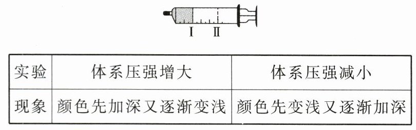如图所示,用 $50\ mL$ 注射器吸入约 $20\ mL$ $NO_{2}$ 和 $N_{2}O_{4}$ 的混合气体(使注射器的活塞处于Ⅰ处),将细管端用橡胶塞封闭。然后把活塞拉到Ⅱ处,观察管内混合气体颜色的变化。当反复将活塞从Ⅱ处推到Ⅰ处及从Ⅰ处拉到Ⅱ处时,观察管内混合气体颜色的变化。