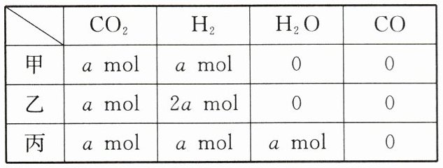(2)现有三个体积相等的定容密闭容器,都进行下列反应:$CO_{2}(g)+H_{2}(g)\rightleftharpoons H_{2}O(g)+CO(g)$。反应所处的温度相同,但起始浓度不同,其中起始时各物质的物质的量如下表: