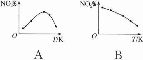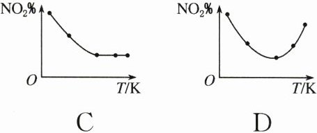 <@@D 解析 在五个相同容积的恒容容器中同时通入等量的NO₂,在不同温度下反应相同时间。有两种可能,一是反应已达到平衡状态,二是反应还没有达到平衡状态,仍然在向正反应方向进行。若五个容器中的反应均已达到平衡状态,因为正反应是放热反应,温度升高,平衡向逆反应方向移动,NO₂的体积分数随温度的升高而增大;若五个容器中有未达到平衡状态的反应,那么温度越高,反应速率越大,会出现温度较高的NO₂转化得快,NO₂的体积分数小的情况。故D图符合,其中转折点为平衡状态,转折点左侧为未平衡状态,右侧为平衡状态。