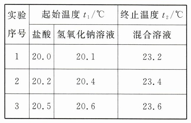 (2)假设盐酸和氢氧化钠溶液的密度都是 1 g·cm⁻³,又知中和反应后生成溶液的比热容 c = 4.18 J·g⁻¹·℃⁻¹。为了计算反应热,某学生记录实验数据如下: