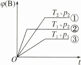 D@@解析:由“先拐先平,数值大”原则,对比①②可知T₁>T₂,对比②③可知p₂>p₁;对比①②,温度由T₂升高到T₁,φ(B)减小,说明升温平衡向正反应方向移动,所以正向为吸热反应;对比②③,由p₁加压到p₂,φ(B)增大,说明加压平衡向逆反应方向移动,所以逆向为体积减小的反应,即m + n<p。