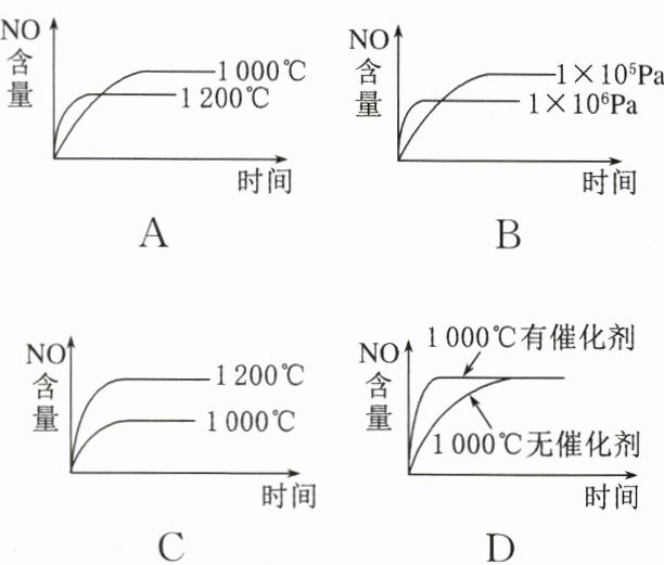 C@@解析:因为正反应为放热反应,升高温度,反应速率加快,达到平衡所用时间减少,但是平衡向逆反应方向移动,NO的含量减小,A项正确,C项错误;增大压强,反应速率加快,达到平衡所用时间减少,正反应为气体体积增大的反应,增大压强,平衡向逆反应方向移动,NO的含量减小,B项正确;催化剂对平衡没有影响,只是加快反应速率,缩短达到平衡所用的时间,D项正确。