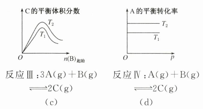 (3)图(c)表示随起始时$n(B)$的增大,在两种不同温度下C的体积分数$\varphi(C)$先增大后减小的变化曲线。$T_2$时$\varphi(C)$高于$T_1$时$\varphi(C)$,可能有两种情况:若$T_2>T_1$,即升温平衡右移,$\Delta H>0$;若$T_2<T_1$,即降温平衡右移,$\Delta H<0$。