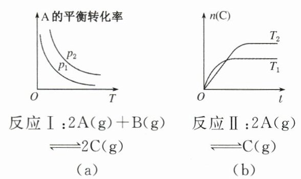 (1)对反应Ⅰ而言,增大压强,平衡向右移动,A的转化率$\alpha(A)$增大,所以$p_2>p_1$;图(a)表示随温度升高,$\alpha(A)$减小,平衡向左移动,则正反应是放热反应,$\Delta H<0$。