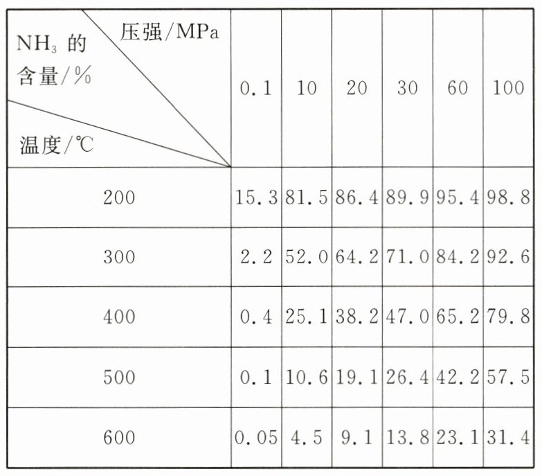 表格中的实验数据是在不同温度和压强下,达到平衡时平衡混合物中 NH₃ 的含量(体积分数)[投料 $V(N_{2}):V(H_{2}) = 1:3$]