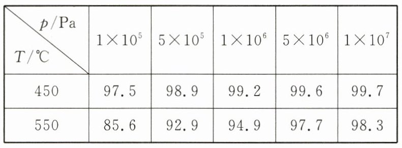 【例】在硫酸工业中,通过下列反应使 SO₂ 氧化成 SO₃:$2SO_{2}(g)+O_{2}(g)\underset{\triangle}{\overset{催化剂}{\rightleftharpoons}}2SO_{3}(g)$ $\Delta H = - 198\ kJ\cdot mol^{-1}$。下表为不同温度和压强下 SO₂ 的转化率(%),回答下列问题: