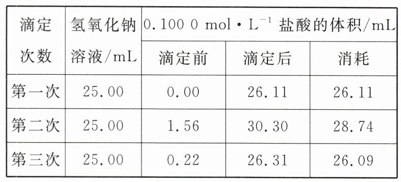 锥形瓶内溶液颜色的变化@@半分钟内不恢复红色@@0.00@@26.10@@0.104 4 mol·L⁻¹