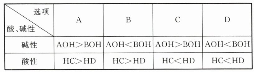综上可知,电离程度:$HC = AOH>HD = BOH$,即酸性:$HC>HD$,碱性:$AOH>BOH$。