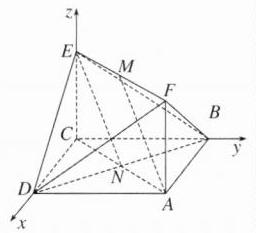 设$AC\cap BD = N$,连接$NE$,则点$N$,$E$的坐标分别为$(\frac{\sqrt{2}}{2},\frac{\sqrt{2}}{2},0)$,$(0,0,1)$。所以$\overrightarrow{NE}=(-\frac{\sqrt{2}}{2},-\frac{\sqrt{2}}{2},1)$。又点$A$,$M$的坐标分别是$(\sqrt{2},\sqrt{2},0)$,$(\frac{\sqrt{2}}{2},\frac{\sqrt{2}}{2},1)$,所以$\overrightarrow{AM}=(-\frac{\sqrt{2}}{2},-\frac{\sqrt{2}}{2},1)$。所以$\overrightarrow{NE}=\overrightarrow{AM}$。又$NE$与$AM$不共线,所以$NE// AM$。又因为$NE\subset$平面$BDE$,$AM\not\subset$平面$BDE$,所以$AM//$平面$BDE$。 (2)由(1)知$\overrightarrow{AM}=(-\frac{\sqrt{2}}{2},-\frac{\sqrt{2}}{2},1)$。因为$D(\sqrt{2},0,0)$,$F(\sqrt{2},\sqrt{2},1)$,所以$\overrightarrow{DF}=(0,\sqrt{2},1)$,所以$\overrightarrow{AM}\cdot\overrightarrow{DF}=0$,所以$\overrightarrow{AM}\perp\overrightarrow{DF}$,即$AM\perp DF$。同理,$\overrightarrow{AM}\perp\overrightarrow{BF}$,即$AM\perp BF$。又$DF\cap BF = F$,且$DF\subset$平面$BDF$,$BF\subset$平面$BDF$,所以$AM\perp$平面$BDF$。