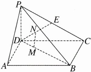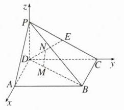 以$D$为原点,$DA$,$DC$,$DP$所在直线分别为$x$轴、$y$轴、$z$轴建立空间直角坐标系,则$D(0,0,0)$,$A(1,0,0)$,$B(1,2,0)$,$P(0,0,1)$,$E\left(0,1,\frac{1}{2}\right)$,$N\left(0,\frac{1}{2},\frac{1}{4}\right)$,$M\left(\frac{1}{4},\frac{1}{2},0\right)$,所以$\overrightarrow{AP}=(-1,0,1)$,$\overrightarrow{MN}=\left(-\frac{1}{4},0,\frac{1}{4}\right)$,所以$\overrightarrow{MN}=\frac{1}{4}\overrightarrow{AP}$,故$MN // AP$。 证法二:由题意可得$\overrightarrow{MN}=\overrightarrow{MD}+\overrightarrow{DN}=\frac{1}{4}\overrightarrow{BD}+\frac{1}{2}\overrightarrow{DE}=\frac{1}{4}\overrightarrow{BD}+\frac{1}{2}\times\frac{1}{2}(\overrightarrow{DC}+\overrightarrow{DP})=\frac{1}{4}\overrightarrow{BD}+\frac{1}{4}\overrightarrow{DC}+\frac{1}{4}\overrightarrow{DP}=\frac{1}{4}\overrightarrow{BC}+\frac{1}{4}\overrightarrow{DP}=\frac{1}{4}(\overrightarrow{AD}+\overrightarrow{DP})=\frac{1}{4}\overrightarrow{AP}$,所以$MN // AP$。